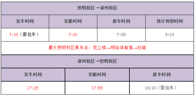 结合学校近期工作安排和教学任务调整,2022年12月19日至12月30日(工作日),厦漳通勤车船安排暂按以下方案执行。如因情况变化需进行调整,另行通知。